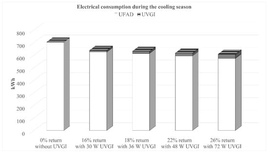 For each critical mixing ratio, the electrical power consumption of the UFAD system was calculated based on the summer indoor design conditions for Beirut (22 °C, 50% RH) and a cooling system COP of 2.0. The results of the hourly energy simulations, performed over the three-month cooling season excluding weekends, are shown in Figure 9. The graph presents the total electrical consumption (kWh/day) of the system throughout the whole season for conditions that meet the microbiological air quality requirements. Additionally, the power consumption of UV lamps was considered.