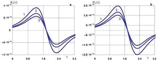 Table 2 shows the exact values of the function and the values of its expansion in the Taylor series (42) with a limit of three terms for three levels of reliability, calculated for 0.001, 0.003 in the interval . Figure 1 demonstrates their corresponding total residual terms , calculated by (37), where is the middle of the interval . Curves 1–3 correspond to the values , 0.95, 0.99 for (Figure 1a) and (Figure 1b). Since varying the parameters within a wide range gives a similar result (Figure 1); therefore, we assume that the restriction to three terms of the series (41) sufficiently approximates the function (37).