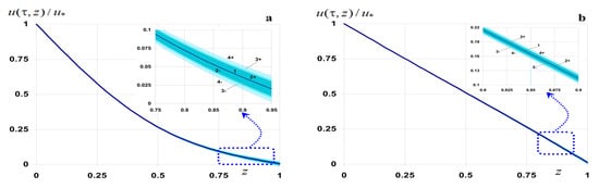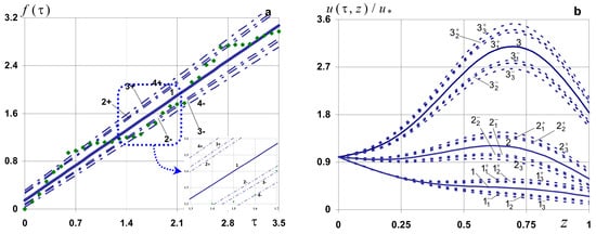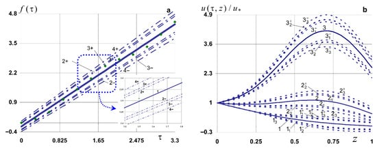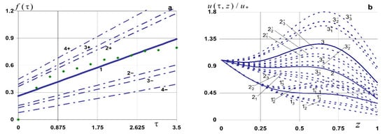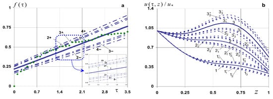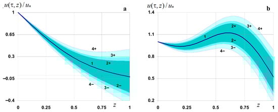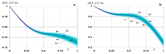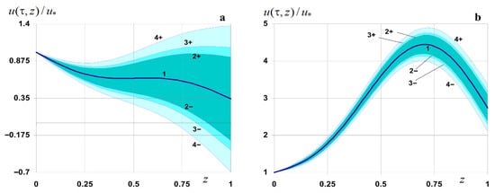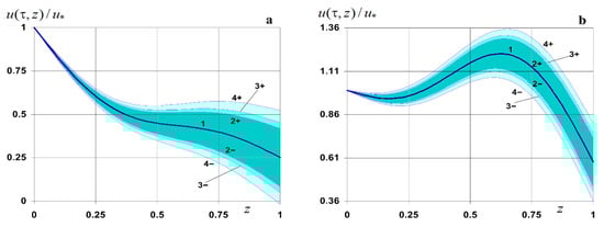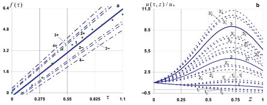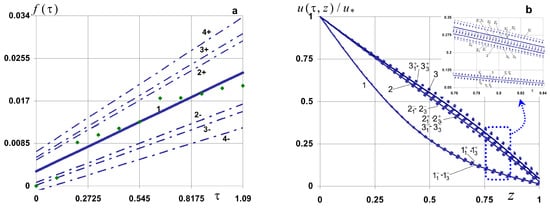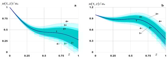 Figures 2, 4, 6, 8, 10, and 12 demonstrate linear regression for the relevant sample (Figures 2a, 4a, 6a, 8a, 10a, and 12a) and solutions to the boundary value problem (1)–(3), (7) (Figures 2b, 4b, 6b, 8b, 10b, and 12b). In Figures 2a, 4a, 6a, 8a, 10a, and 12a, solid lines (curves 1) indicate the function , the dashed and dotted lines indicate its reliable intervals (curves 2−, 3−, 4− and 2+, 3+, 4+), and the green dots indicate the experimental data presented in the corresponding table. Figures 2b, 4b, 6b, and 10b show solutions to the initial boundary value problem (solid lines) for long time intervals at time moments 0.1, 0.5, 2 (curves 1–3). Figures 8b and 12b show the same solutions for short time intervals at time moments 0.1, 0.5, 1 (curves 1–3). The curves (dashed lines) with the index “+” are calculated for the upper limits of the reliable intervals , and with the index “−” for the lower ones . The lower indices 1, 2, 3 correspond to the values of the reliability level , 0.95, 0.99. Figures 3, 5, 7, 9, 11 and 13 show solutions to the initial boundary value problem , that are normalized to the value of the function on the upper boundary of the layer , and the corresponding bilateral critical domains calculated by the Fisher criterion, for 0.1 (Figures 3a, 5a, 7a, 9a, 11a and 13a) and 0.5 (Figures 3b, 5b, 7b, 9b, 11b and 13b). Curves 2−, 2+ are calculated for , curves 3−, 3+ are calculated for , and curves 4−, 4+ are calculated for .