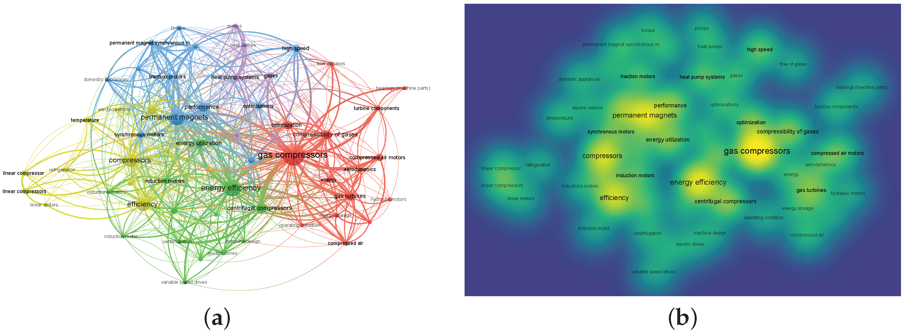 The resulting software provides a solid foundation for further analysis of trends in control methods (e.g., load-adaptive operation), innovations in materials and configurations, and comparative efficiency evaluations in rotary screw compressors and their associated drive systems. The bibliometric analysis performed using VOSviewer (1.6.20) reveals a high co-occurrence of terms such as compressors, electric motors, efficiency, energy utilization, and thermal management systems, confirming the close relationship between these components in the study of thermal and industrial systems (