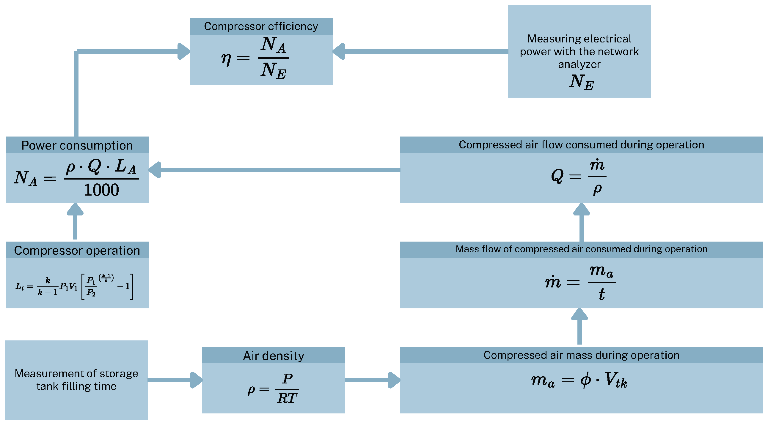 3 storage tank, and recording pressure and temperature values at start-up and shutdown. From these data, air density was calculated, followed by the determination of the stored air mass, the mass flow rate, and finally the volumetric flow rate, using fundamental thermodynamic equations. This stepwise methodology, summarized in the flow diagram of