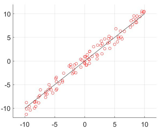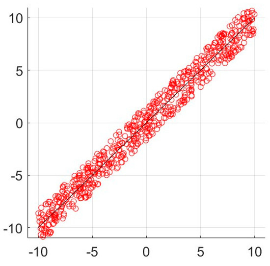 For MATLAB (R2022) simulation over a Core i5 Laptop, we consider a (randomly generated) dataset of data points and a network of agents each having access to of the (randomly chosen) data points. The dataset is shown in Figure 1. Each agent performs local regression analysis on its own batch of data and shares the regressor parameters over an Erdos–Renyi (ER) random network. The linking probability of the connected ER network is . The objective function to be optimized is in the form (6)–(7). We compare the convergence under the nonlinear dynamics with different signum-based models (18)–(19) (as the discrete version of (11)–(12)) with and .) Following Algorithm 1, agents update their regressor parameters based on the proposed dynamics and share their states and over the network. We consider four scenarios for comparison of the convergence rate and the optimality gap.