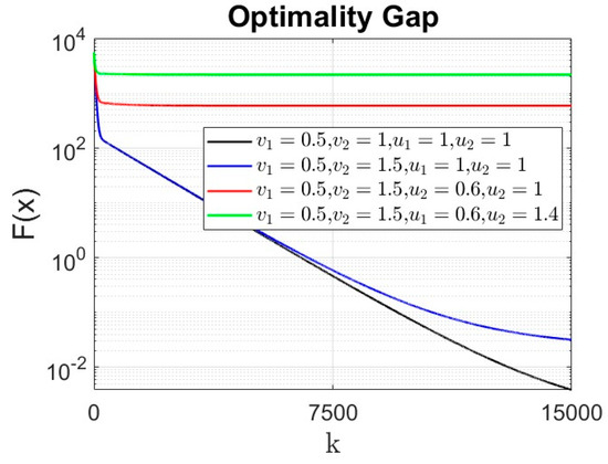 Table 2 summarizes the effect of the parameters , , , on the optimality gap of the discretized dynamics (18)–(19).