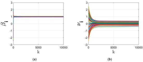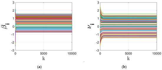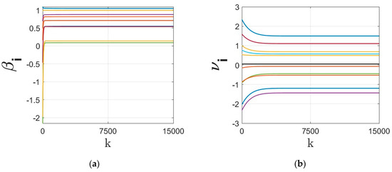 Figure 6. This figure shows the time evolution of the regressor parameters under Case (iv). - Next, to strengthen the generalizability of the results, we redo the simulations for large-scale example with data points and a network of agents each having access to of the (randomly chosen) data points. The large dataset is shown in Figure 7. We redo the simulation on local regression with the objective function (6)–(7) over an ER random network with linking probability. For this simulation, we set different values for step size as and gradient tracking rate as . Note that large step sizes, although they may lead to faster convergence, may result in larger optimality gap of the signum-based dynamics. In case of very large step size the solution may diverge. We compare the optimality gap under four different signum-based models based on (18)–(19) as,