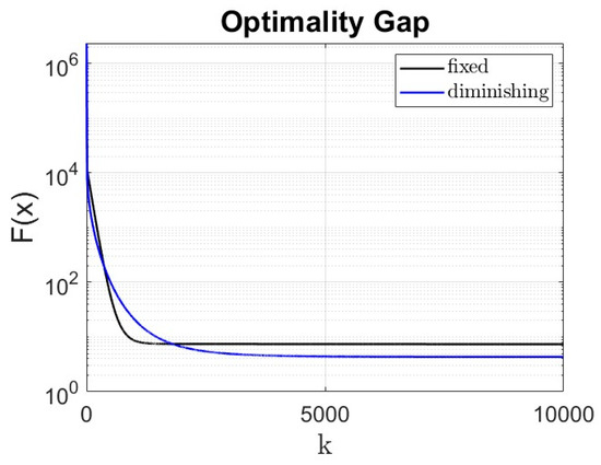 To reduce the optimality gap introduced by non-Lipschitz signum-based update rules (18)–(19), we propose replacing a fixed step size with a diminishing step size sequence. Diminishing step sizes (e.g., or balance the following two competing needs: early iterations require sufficiently large updates to exploit fast transient convergence by the signum dynamics, while later iterations require progressively smaller updates to attenuate persistent bias and oscillations caused by the non-Lipschitz terms. Formally, a diminishing sequence that is positive, nonincreasing, and satisfies preserves asymptotic convergence. In our context, this yields to vanishing optimality gap as , while on the other hand it slows the convergence. Therefore, diminishing step sizes also provide a trade-off finite time convergence rate for improved asymptotic optimality in signum-based distributed algorithms. This is better demonstrated later by the simulations in Section 5.1.