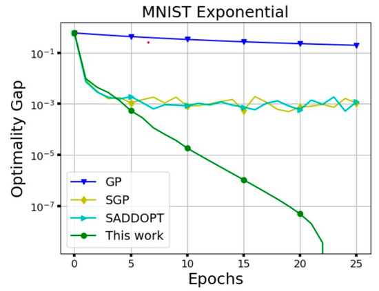 - For the next simulation, we consider the MNIST dataset and the optimization data from [63]. We randomly select labelled images from this dataset and classify these images via logistic regression with a convex regularizer over an exponential network of computing nodes. For this problem, the global cost function iswith each computing node taking a batch of sample images. Then, every node locally minimizes the following objective function:where denote the parameters of the separating hyperplane for classification. The optimization residual (or the optimality gap) of the signum-based Algorithm 1 with is compared with some existing algorithms in the literature. The following algorithms are considered for comparison: GP [64], SGP [65], S-ADDOPT [66]. The comparison results are shown in Figure 14. As it is clear from the figure, by choosing , and moderately close to , Algorithm 1 reaches fast convergence with sufficiently low optimality gap.