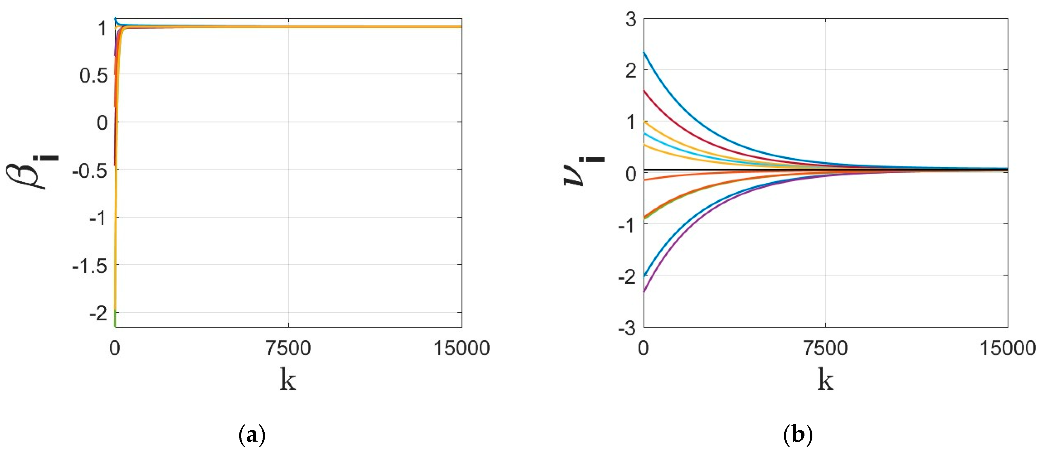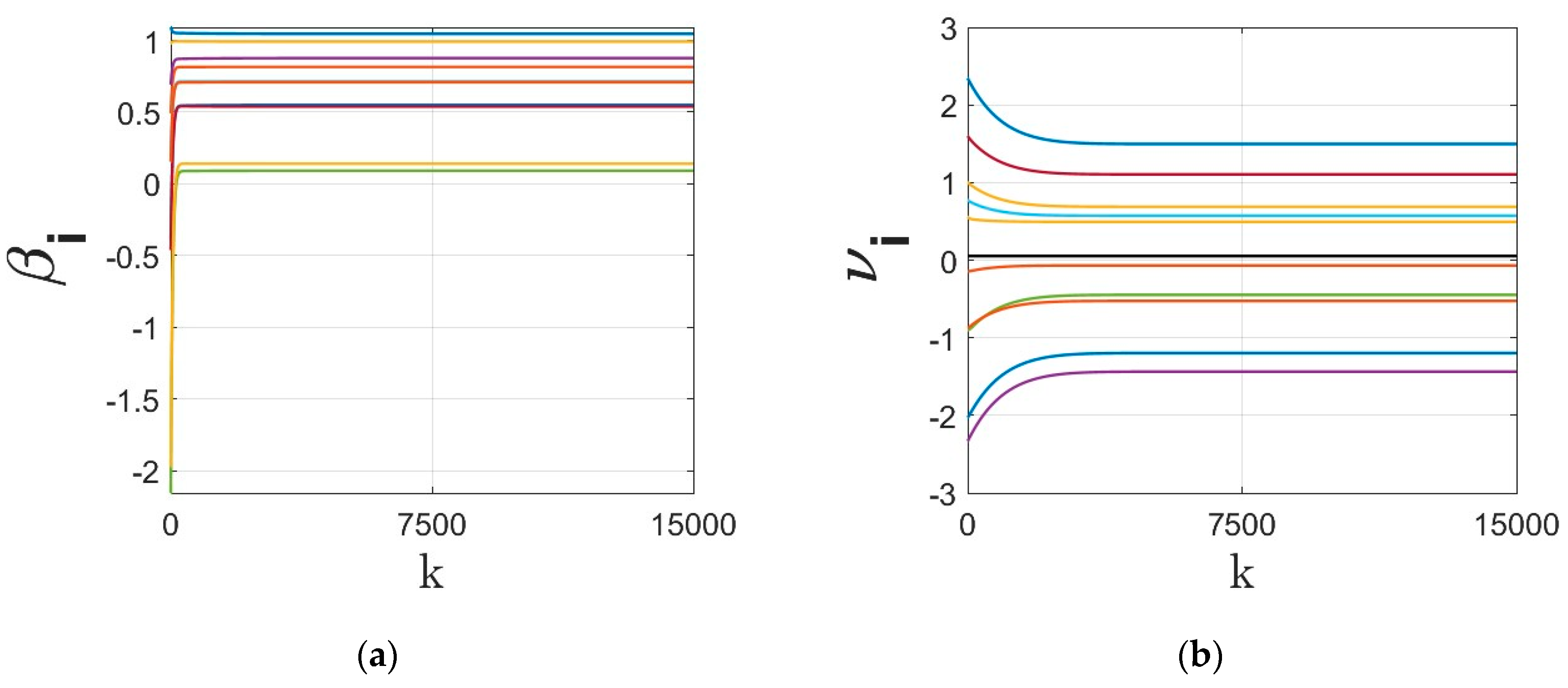 - The residual cost function over iteration is compared in Figure 8. Despite the finite time convergence, the solution may result in steady-state residual or optimality gap depending on the parameters , , , . To better highlight this optimality gap on the regressor line parameters , these parameters are shown in Figure 9, Figure 10, Figure 11 and Figure 12 for different cases under signum-based dynamics. It is clear that applying sign function may result in steady-state error, especially for , where the gradient tracking is under signum-based nonlinearity (e.g., see Figure 11 and Figure 12).