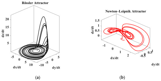 For modulating monitoring signals, we generated two chaotic systems exhibiting just one attractor: the Rössler and the Newton–Leipnik attractors. These dynamic systems were selected for their simplicity in their coefficients in the differential equations.