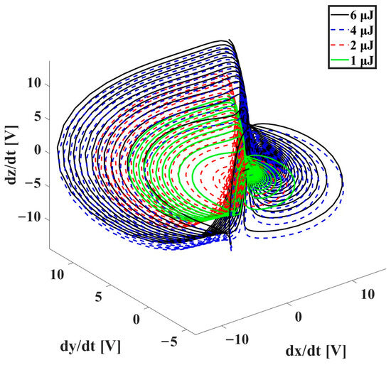 At lower energy (2 µJ), the attractor showed compact and symmetric shapes, indicating a stable and low-response regime. At 3 µJ and 4 µJ, the attractor began to stretch and oscillate with greater amplitude, suggesting early activation of bioelectrical dynamics. At 5 µJ and especially 6 µJ, the attractor became asymmetric and highly irregular, with dense loops and extended lobes, indicating strong chaotic activity induced by thermal and structural changes in the seed tissue. These changes in attractor morphology reflect variations in induced voltage and impedance. Specifically, at 6 µJ, the peak voltage reached up to 3.2 V and impedance showed nonlinear shifts, supporting the sensitivity of this method to detect early-stage bioelectrical transformations.