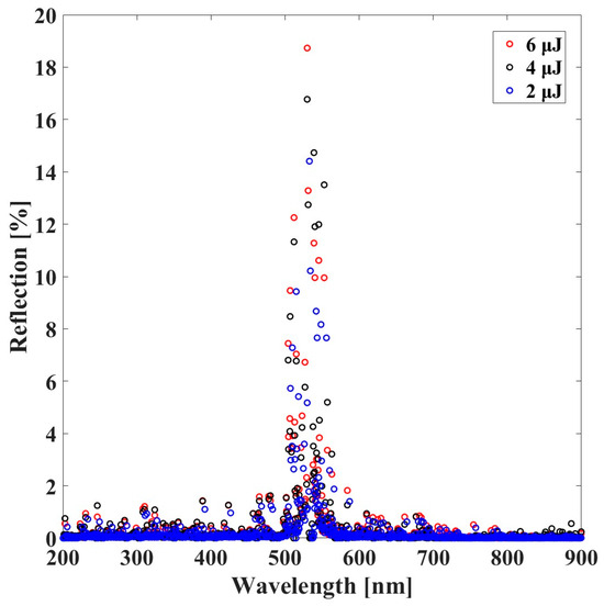 Figure 6 illustrates the reflectance measurements of the seed under laser irradiation, with the laser power varying between 2 µJ and 6 µJ. The data clearly show that the reflectance behavior depends significantly on the laser power, and the wavelength corresponding to the highest irradiance is centered at 532 nm, matching the wavelength of the laser used in the experiment. At a laser energy of 6 µJ, the reflectance reached its maximum value of 19%, as indicated by the red points. This peak demonstrates the strong optical interaction between the laser and the seed surface at this energy level. For a laser energy of 4 µJ, the reflectance decreased slightly to 17%, represented by the black points. This reduction suggests less optical coupling or surface modification at this lower energy. At the lowest laser power of 2 µJ, the reflectance was observed to be 14%, as indicated by the blue points. This reflects the minimal photothermal effect and optical response of the seed at this energy level. The laser beam was focused on the seed using a plano-convex lens with a focal length of 10 cm. This lens configuration ensured precise and concentrated energy delivery to the target area, which is crucial for achieving the observed reflectance variations.