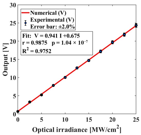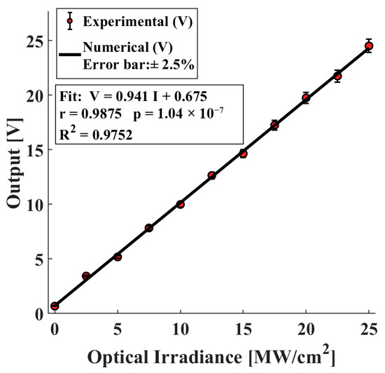 We measured the sensor’s output voltage at ten fixed light levels and averaged repeated readings. A straight-line fit was applied; , it was used in Figure 8.