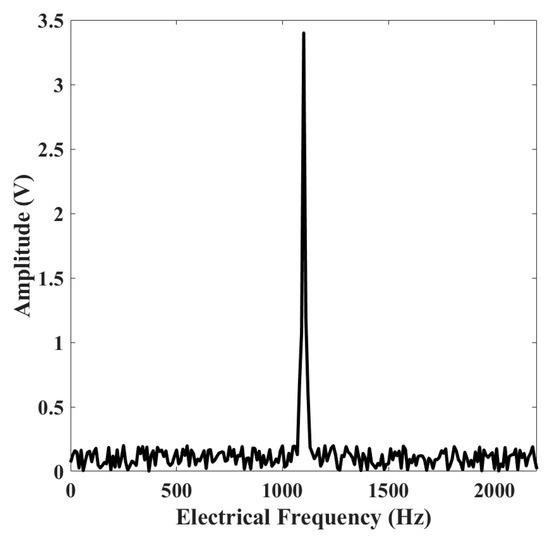 A dominant peak is clearly observed at approximately 1100 Hz, indicating a strong periodic or quasi-periodic component within the electrical signal. The surrounding frequency range displays a relatively low amplitude baseline, suggesting that the attractor maintains a coherent oscillatory structure with minimal spectral dispersion.