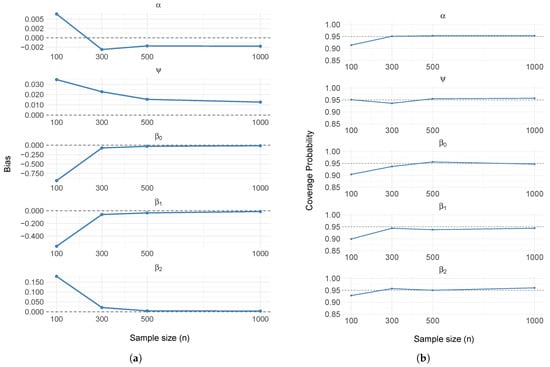 For the simulation study, the vector of true values was chosen as . These values were based on posterior means from the application in the Section 3.2, except for the effect , which was selected arbitrarily due to the lack of continuous covariates in the dataset. We chose to include this effect of a continuous variable in the Algorithm 1 to illustrate the capability of our regression model to handle such information. Convergence statistics () based on two chains per iteration were close to 1 for all parameters across sample sizes. Figure 1 presents the values of the bias and the coverage probability across the sample sizes evaluated for the parameter vector .