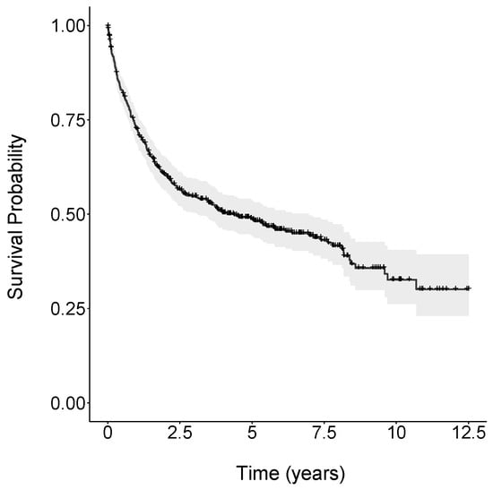 In our study, we considered the failure time as the period between the date of the patient’s diagnosis of uterine cancer and the date of the last available information regarding their health status (cancer-free, living with uterine cancer, or death due to uterine cancer or other causes). The event of interest was defined based on death attributed to uterine cancer. The dataset contains 490 individuals, and the censoring proportion is approximately 0.4735. Figure 2 presents the nonparametric Kaplan–Meier estimator for the uterine cancer dataset, along with the 95% confidence interval. A plateau is observed after approximately 10 years of patient follow-up, suggesting the potential presence of cured individuals within the population.