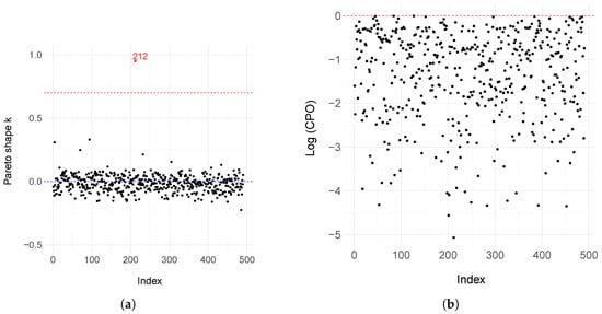 For the individual values of of the generalized Pareto distribution, ref. [44] guarantee reliable estimates under the central limit theorem for . If the estimated tail shape parameter exceeds 0.5 but is less than 0.7, the estimation the generalized central limit theorem for stable distributions holds. If , the approximation is not reliable and it is an evidence of influential data point in the Bayesian model. If , the variance and the mean of the raw ratios distribution do not exist and it affects directly the estimation of PSIS-LOO, indicating poor predictive performance [44].