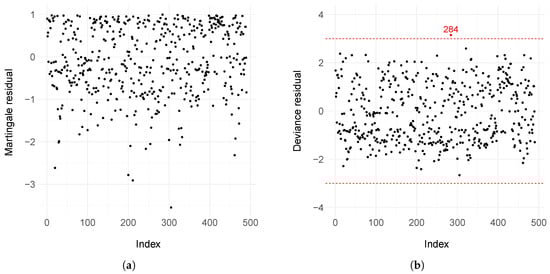 - Therneau, T.M.; Grambsch, P.M.; Fleming, T.R. Martingale-based residuals for survival models. Biometrika 1990, 77, 147–160. [Google Scholar] [CrossRef]