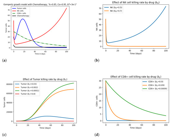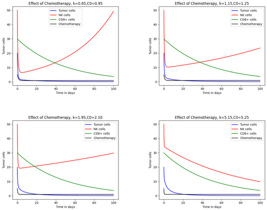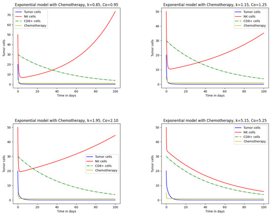 Figure 3 presents the effect of chemotherapeutic drugs on cell populations under exponential growth. Tumor and immune cell dynamics were examined for , , , and with decay rates , , , and , respectively. In the first case, with and , tumor cells are completely eliminated while natural cells remain unaffected. NK cells decline initially but later recover due to drug influx. Such a situation is unlikely because realistically, at the initial stage, the whole tumor has been eradicated. Although tumor cells are eliminated, the treatment also affects healthy cells. At higher values, such as , both tumor and immune cell populations decrease sharply. In severe cases, NK cells are entirely eliminated, indicating host mortality. Increasing from to , , and produces marked changes in tumor and immune cell behavior, as shown in Figure 2 and Figure 3, where and . These results demonstrate that chemotherapy consistently destroys tumor cells but also damages healthy cells. A comparison of Figure 2 and Figure 3 shows that drug effects on healthy cells are less pronounced under logistic growth, while exponential growth leads to greater impairment. Thus, the logistic growth model yields more favorable outcomes than exponential growth for the same parameter values.