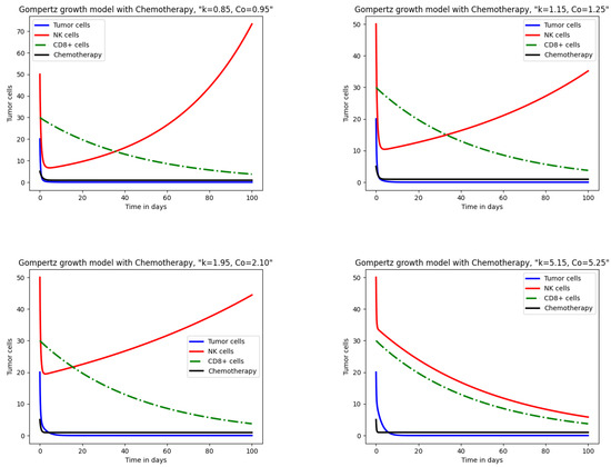 Impact of chemotherapy on tumor and immune cells for the Gompertz growth model.