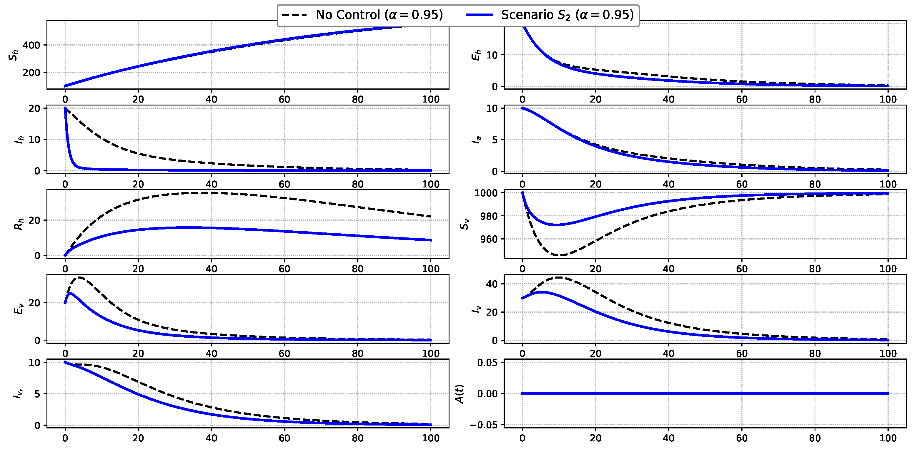 Figure 4. Comparison of state variables under Scenario S 2 and the uncontrolled baseline.