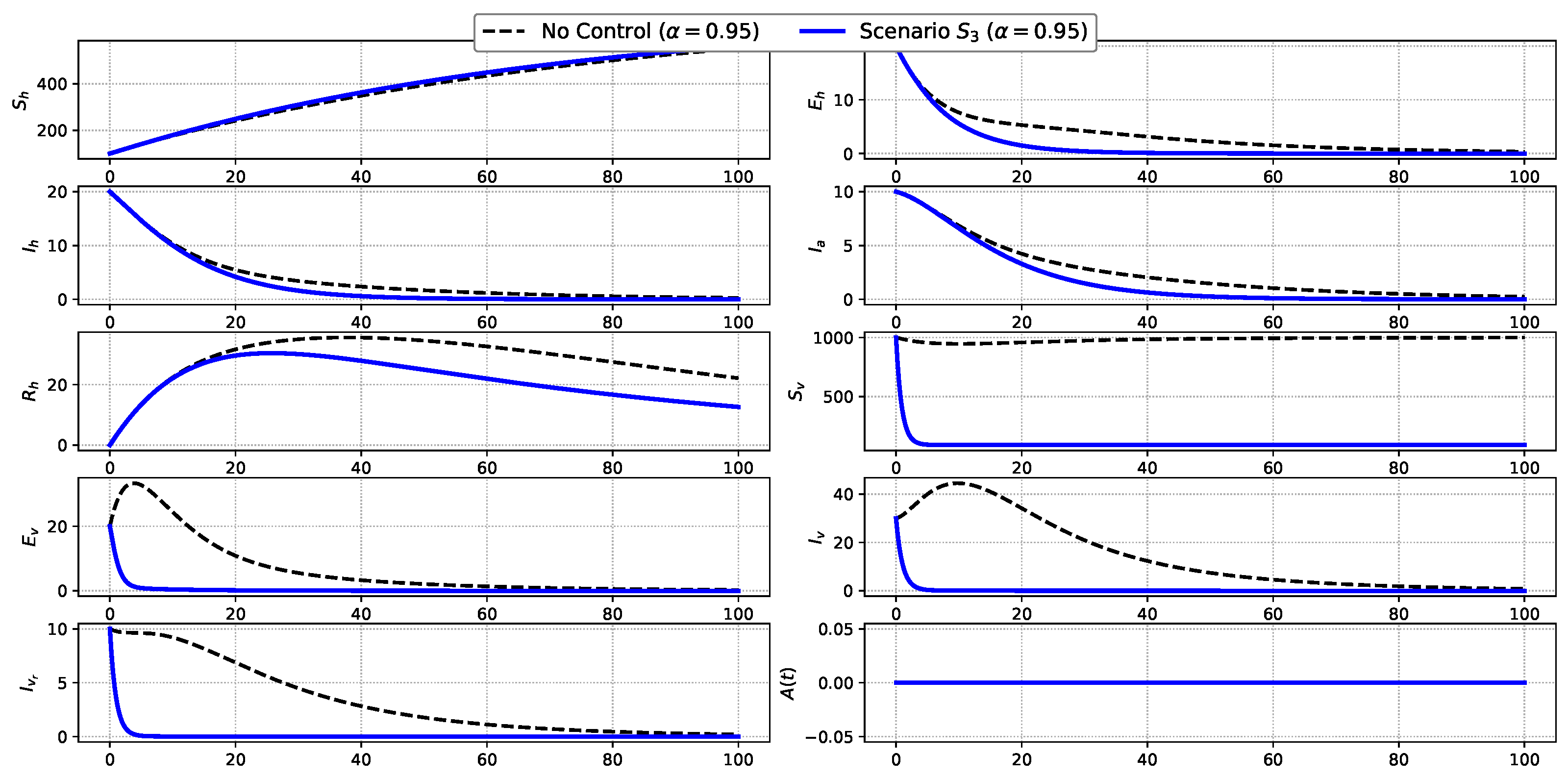 W ( t ) : = min { S h ( t ) , E h ( t ) , I h ( t ) , I a ( t ) , R h ( t ) , S v ( t ) , E v ( t ) , I v ( t ) , I v r ( t ) , A ( t ) } .