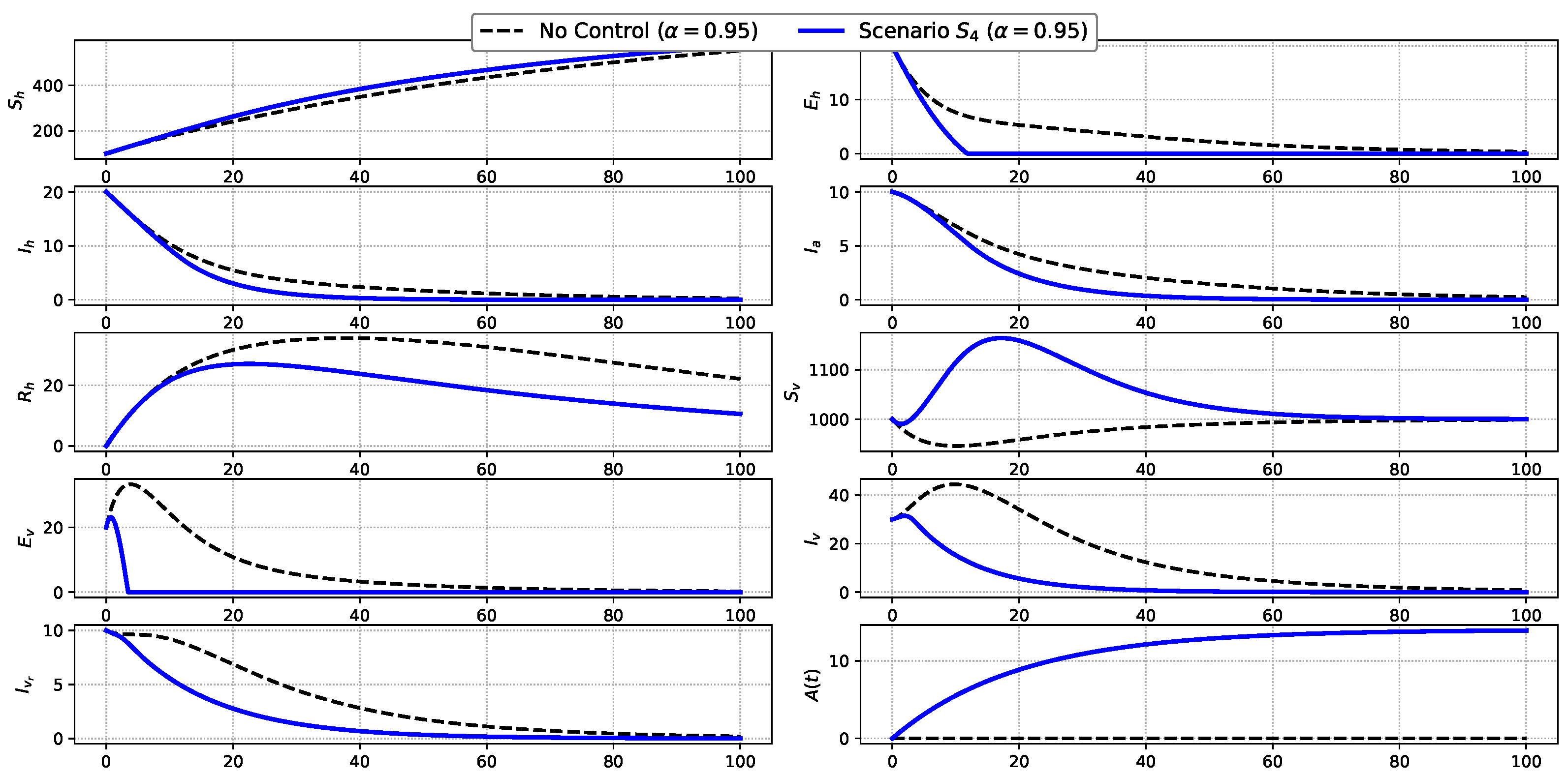 Figure 6. Comparison of state variables under Scenario S 4 and the uncontrolled baseline.