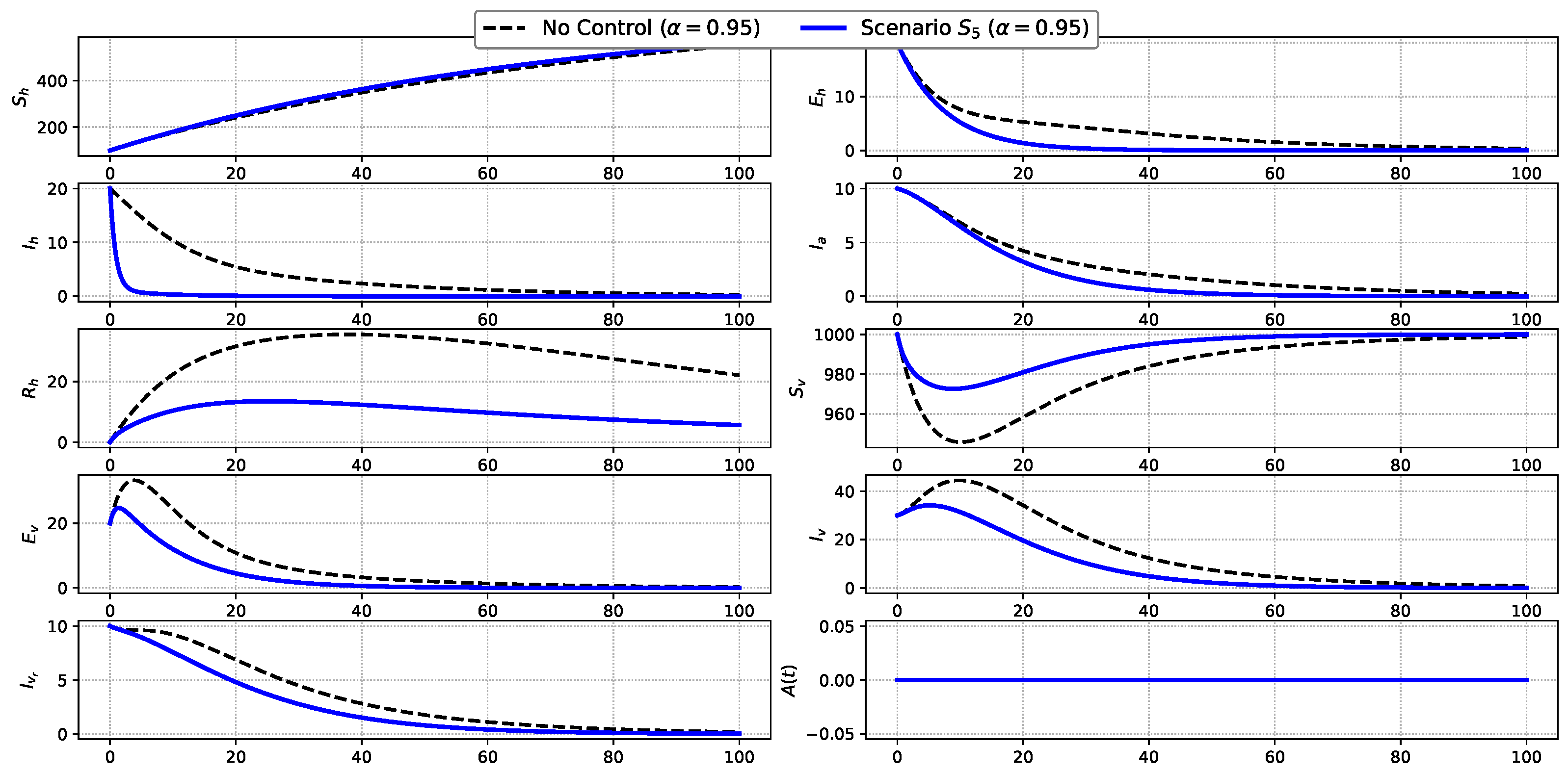 Figure 7. Comparison of state variables under Scenario S 5 and the uncontrolled baseline.