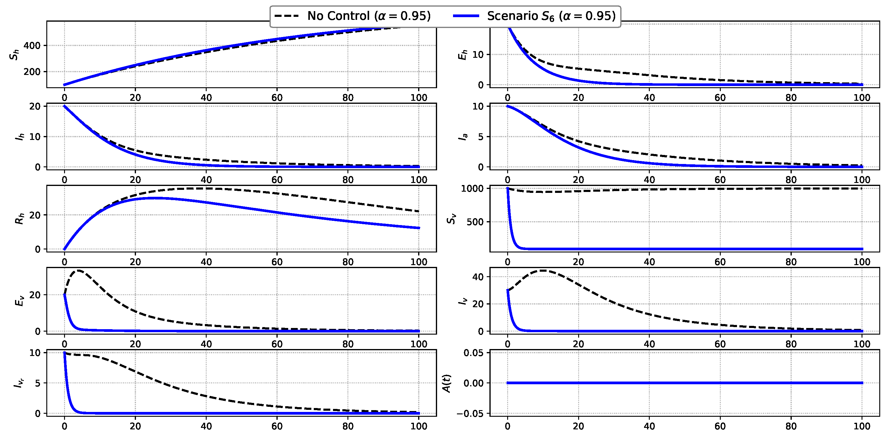 Figure 8. Comparison of state variables under Scenario S 6 and the uncontrolled baseline.