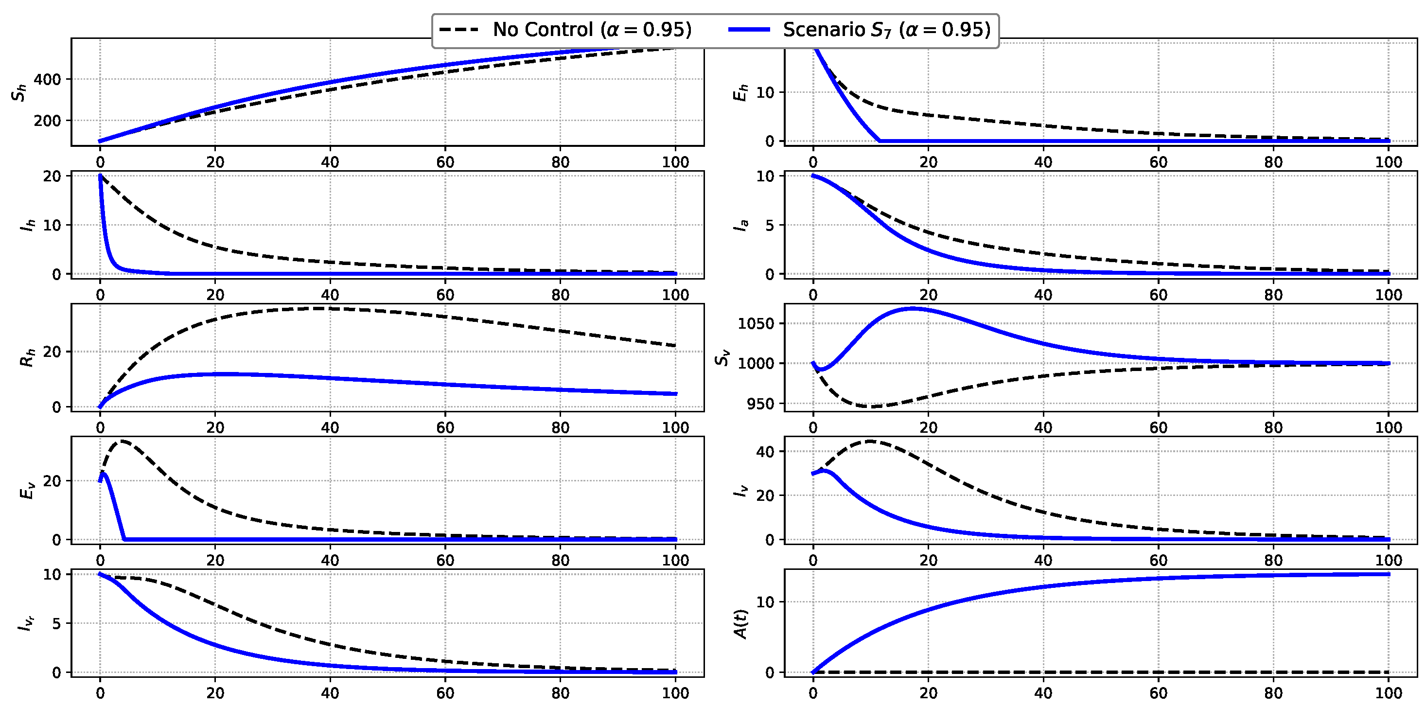 Figure 9. Comparison of state variables under Scenario S 7 and the uncontrolled baseline.