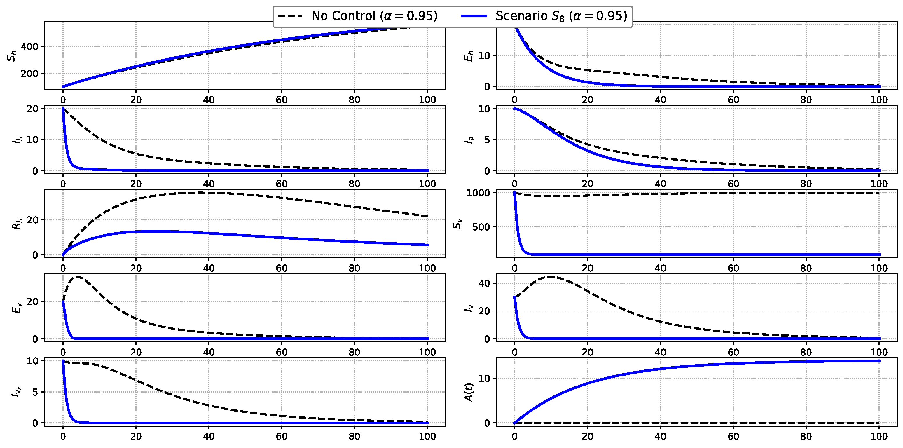 Figure 10. Comparison of state variables under Scenario S 8 and the uncontrolled baseline.