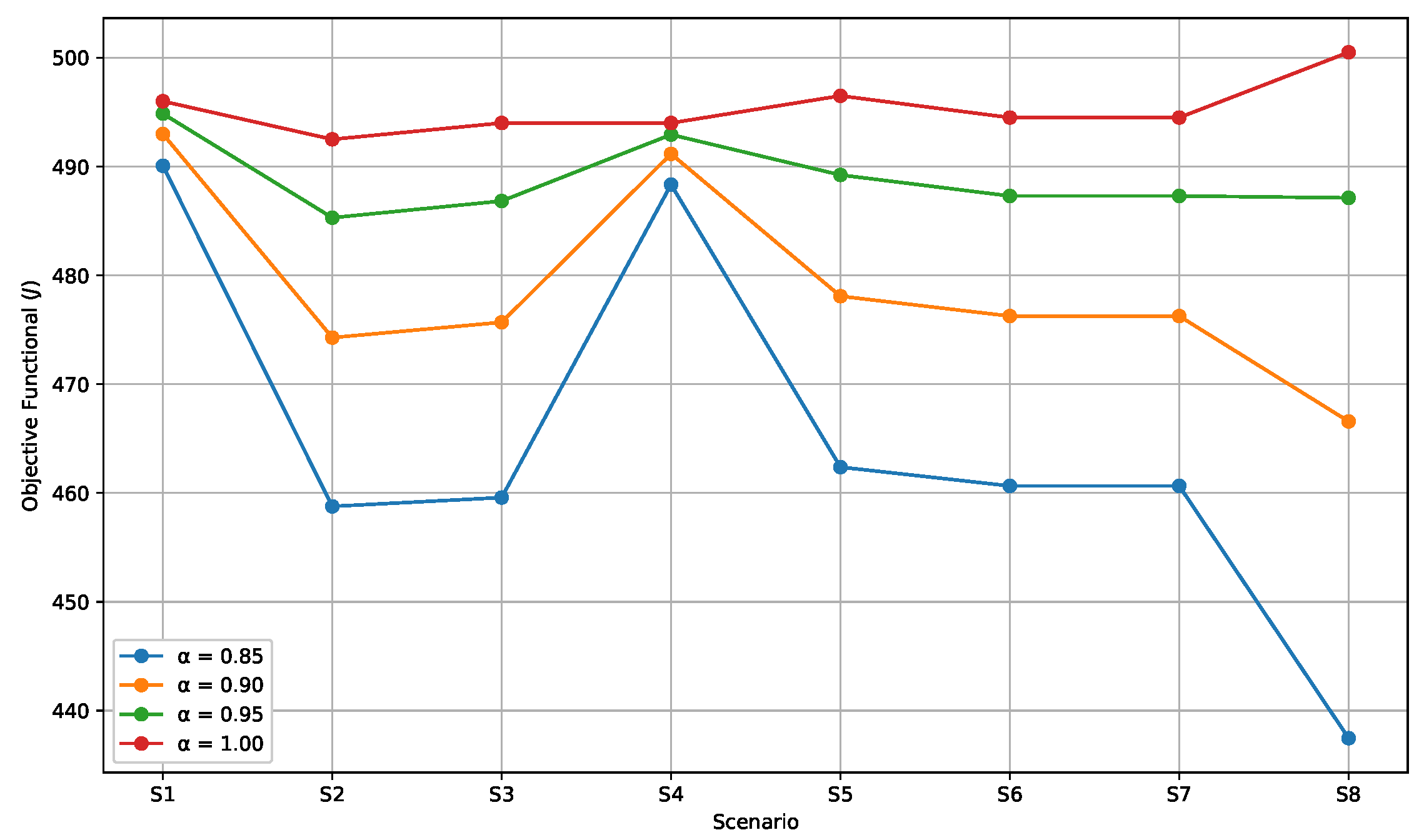 Figure 12. Effect of parameter α under scenario S 8 .