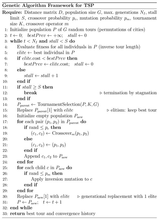 In this paper, a tournament selection method is implemented [28]. This is consistent with recent EA applications to TSP [20,29,30,31]. It is a preferred choice for this example compared to standard roulette wheel selection to promote diversity and prevent premature convergence in the early evolutionary search stage. It also allows tunable selection pressure through the tournament size k. For smaller tournaments, selection pressure is lower, giving weaker individuals an increased chance of survival. In this paper, after initial experiments, a tournament of size k = 3 is selected and maintained throughout all evaluations. The procedure of the tournament selection is as follows: Randomly select k individuals and create a tournament. The best individual is directly selected as a parent. Repeat the tournament until the parents’ population is full, i.e., it has the same number of members as the previous population. In this paper, the dimension G is fixed at 200 individuals across all runs. In addition, elitism is also implemented in selection procedures to avoid the complete loss of the best-performing individuals. This means that several of the best individuals from the previous population can be guaranteed to be preserved and transferred to the parents’ population. In this study, one elite member is directly transferred to the next population, which ensures that the convergence function will be monotonous, but also promotes diversity. Namely, a higher number of elite individuals might compromise convergence at an early stage if a local optimum has highly attractive potential.