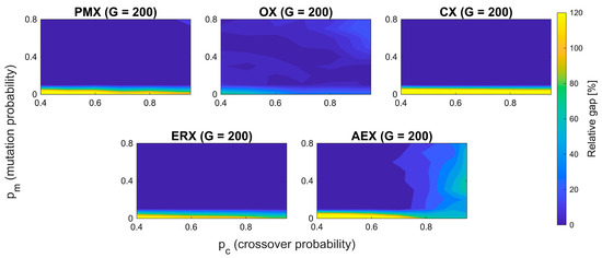 Although AEX shows fragmented behavior, the remaining operators (PMX, OX, CX, ERX) all share broad and stable region pm ≈ [0.4, 0.7] and pc ≈ [0.6, 0.9]. To ensure comparability across operators and to avoid regions that cause clearly unstable behavior in AEX, a common agreement is made on parameters such as pm = 0.4, pc = 0.7, and G = 200. For every operator, this parameter combination lies within its own top 10% performance region. This means that each operator is evaluated under settings which are close to its own best performing region, without giving bias to any parameter. The relative gap is calculated as follows: