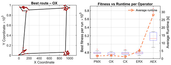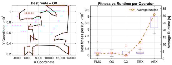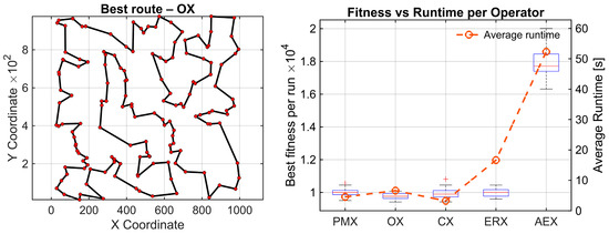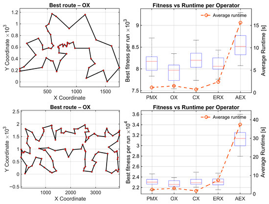 Results for these three benchmark maps are presented in Figure 3. On the left side, the best route found by the statistically best-performing operator for each benchmark is shown. The right side shows box plots summarizing the distribution of shortest routes across 30 independent runs for each crossover operator. The average runtime for every operator is also given for all operators for one full evolutionary run. This is the mean wall-clock time required per operator to execute one complete evolutionary run—all the generations averaged over 30 independent runs. To investigate statistical significance of differences within results for each parameter, statistical analysis is performed using the Friedman test and Wilcoxon post-hoc pairwise comparisons with Holm correction. The use of the Friedman test is validated by performing the Shapiro–Wilk test on paired performance differences for berlin52.tsp. Normality is violated in most comparisons (9 of 10 pairs with ) Based on these results, the parametric ANOVA assumptions are not met, so the Friedman test followed by Holm-corrected Wilcoxon signed-rank test is appropriate. The algorithm runs 5000 generations and evaluates each of the five operators 30 times to get statistically representative samples.