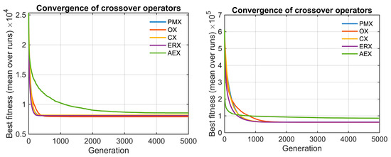 Operators CX, PMX, and OX are the fastest because they rely on simple positional and mapping operations. ERX is slower since it must maintain adjacency lists during recombination, but it remains competitive in terms of run time to CX, PMX, and OX. The AEX is significantly slower, typically 2 to 4 times slower across all experiments, compared to other operators. This underperformance, both in terms of solution quality and run time efficiency, can be linked to its alternating edge construction mechanism. AEX switches between parents’ edges in every step, thus frequently proposing edges that lead to cities already included in the partially constructed tour. This repeatedly triggers the procedure, which replaces the proposed edge with the lowest-indexed unvisited city. The consequence here is that a large fraction of edges in the offspring are not inherited from parents but inserted as the lowest index unvisited city. This has a disruptive effect and destroys repeatedly useful information from parents. It hinders the exploitation of quality links from parents and brings excessive randomness into the offspring. As a consequence, this operator shows higher variance, slower convergence, and less efficient runtime than the other four operators.