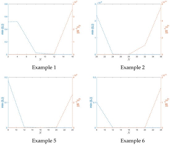 The magnitudes of the 2-norm and spectral radius of for the proposed approach at , with , are presented for Examples 1, 2, 5, and 6.