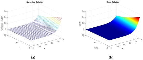 (a) Approximate versus (b) exact solution for Example 1 is presented for distinct values of x and t with .