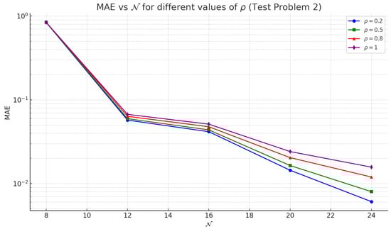 The relaxation parameter plays a critical role in controlling how much the previous iteration contributes to the current update, thereby ensuring a balanced and stable convergence process. In our numerical experiments, its value was selected empirically. We tested several candidate values of and evaluated their corresponding errors, as reported in Table 7, and then fixed the value that provided the best balance between convergence rate and stability for the considered problem configurations. More advanced strategies, such as adaptive line search techniques, may further improve efficiency [35,36].