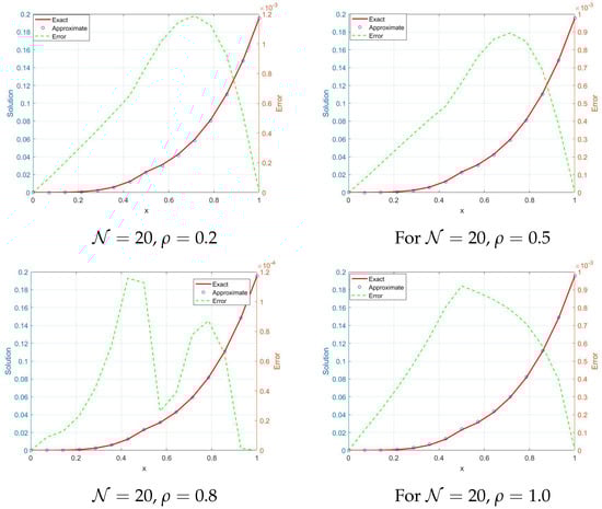 We use the residual error to assess the effectiveness of the suggested MQ-RBF scheme because there is no exact solution for this problem. The residual errors for various values of ρ are reported in Table 4, demonstrating that the technique consistently produces modest residuals even for coarse discretizations. Plotting the numerical solution and associated residual error for and (see Figure 7) allows us to further evaluate the accuracy and validate the stability and dependability of the suggested method.