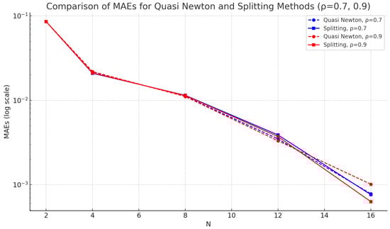 To formulate the computational problem, the exact analytical solution is used to define the initial, boundary, and interface conditions. The MQ-RBF method is then applied to the nonlinear 1D time-fractional interface model, using both quasi-Newton linearization and a new splitting technique to address the nonlinear terms. Table 5 and Table 6 show that for various fractional orders ρ and discretization levels , the MAEs and RMSEs consistently decrease as increases, confirming the accuracy and convergence of the scheme. Although the method performs well for all values of ρ, smaller fractional orders yield slightly higher errors due to stronger memory effects. A comparison of the two linearization strategies indicates that the proposed splitting technique is more accurate and converges faster than the quasi-Newton method. This improvement results from its better handling of nonlinearities while maintaining numerical stability. A more direct comparison can be made by selecting the cases with the largest error reduction. At and , the innovative splitting technique yields an MAE of , which is approximately 38% lower than the MAE from the quasi-Newton method. Similarly, for and , the splitting method achieves an MAE of , showing an improvement of about 25% compared to the quasi-Newton MAE . We also computed the errors for different values of the parameter ω for the splitting method, and the results help in identifying the optimal choice of ω from Table 7. Figure 8 provides a two-dimensional error comparison of the methods, and additional figures (e.g., Figure 9) show the impact of varying for a fixed ρ.