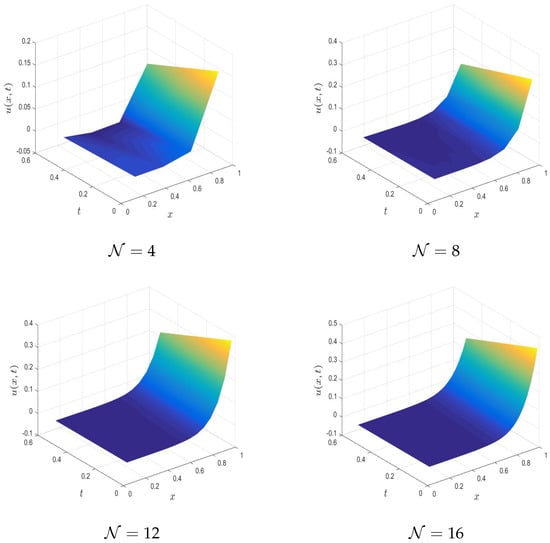 Error analysis for different values of and N with , , and for Example 1 using Caputo derivative.