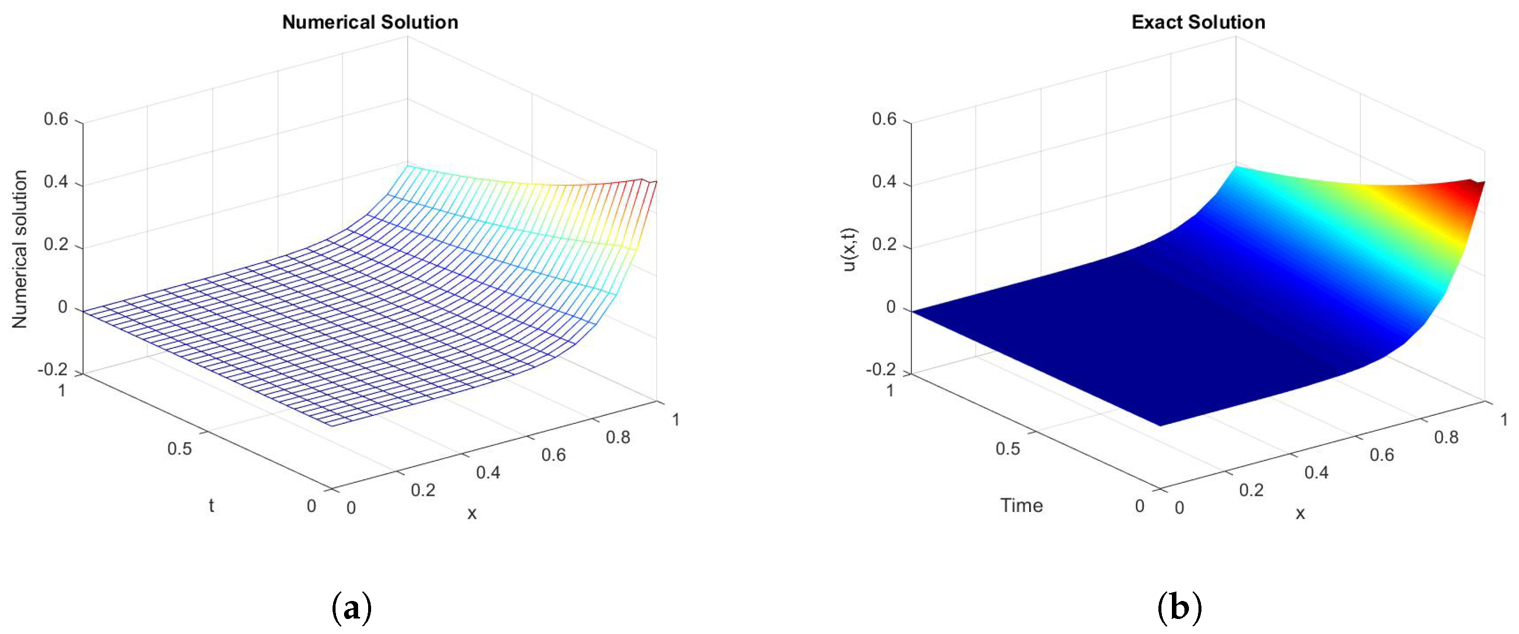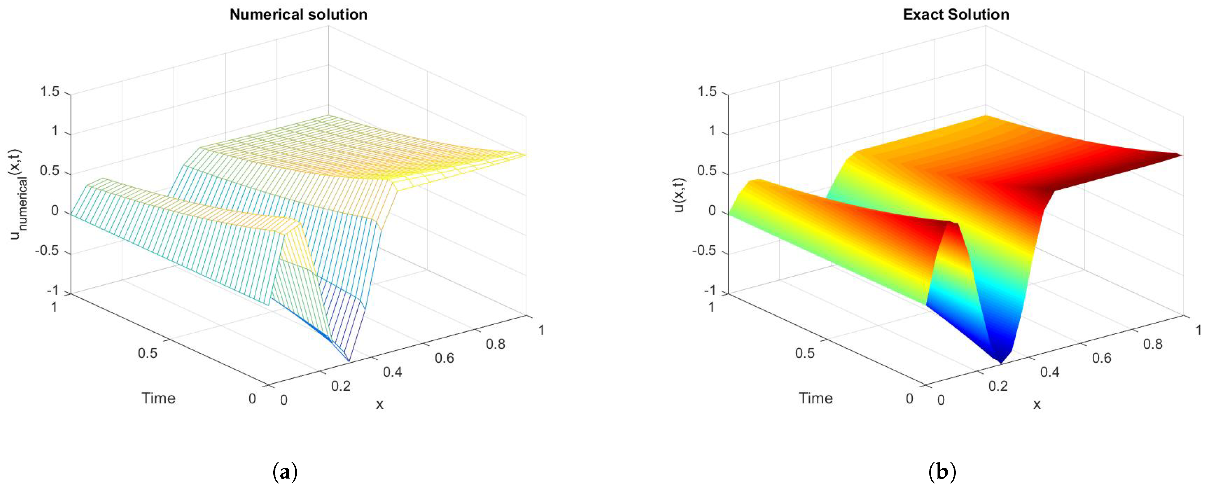 Example 3. As the third example, linear time-fractional interface Problem (1) is considered assuming and . Exact solutions and source functions are given byandwhere is the Mittag–Leffler function of two parameters defined asand This linear 1D time-fractional interface problem is formulated using the exact solution to define the interface, boundary, and initial conditions and is subsequently solved using the MQ-RBF method.