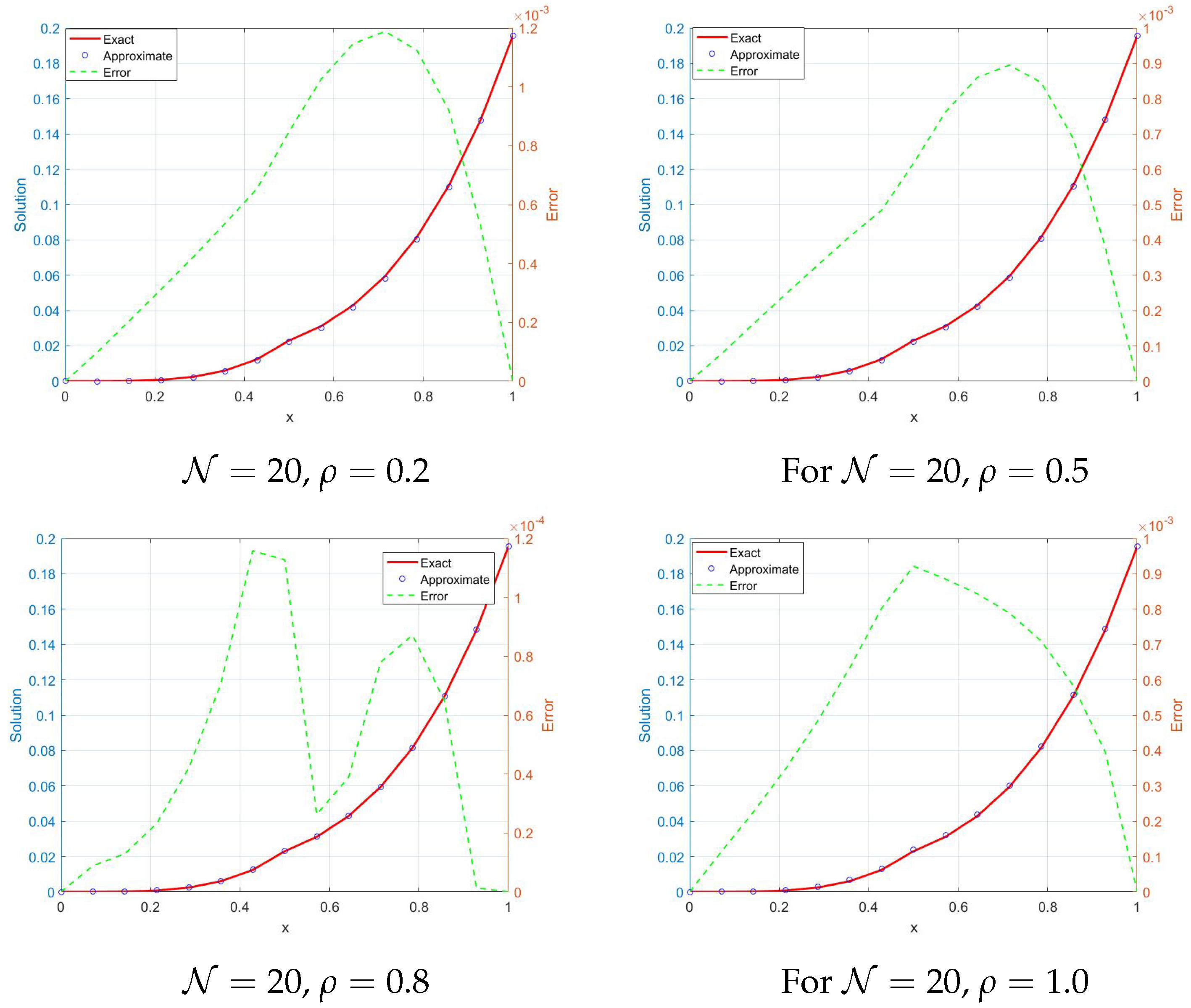 , along with their corresponding error profiles, providing additional insight into the influence of the fractional order on the solution behavior.