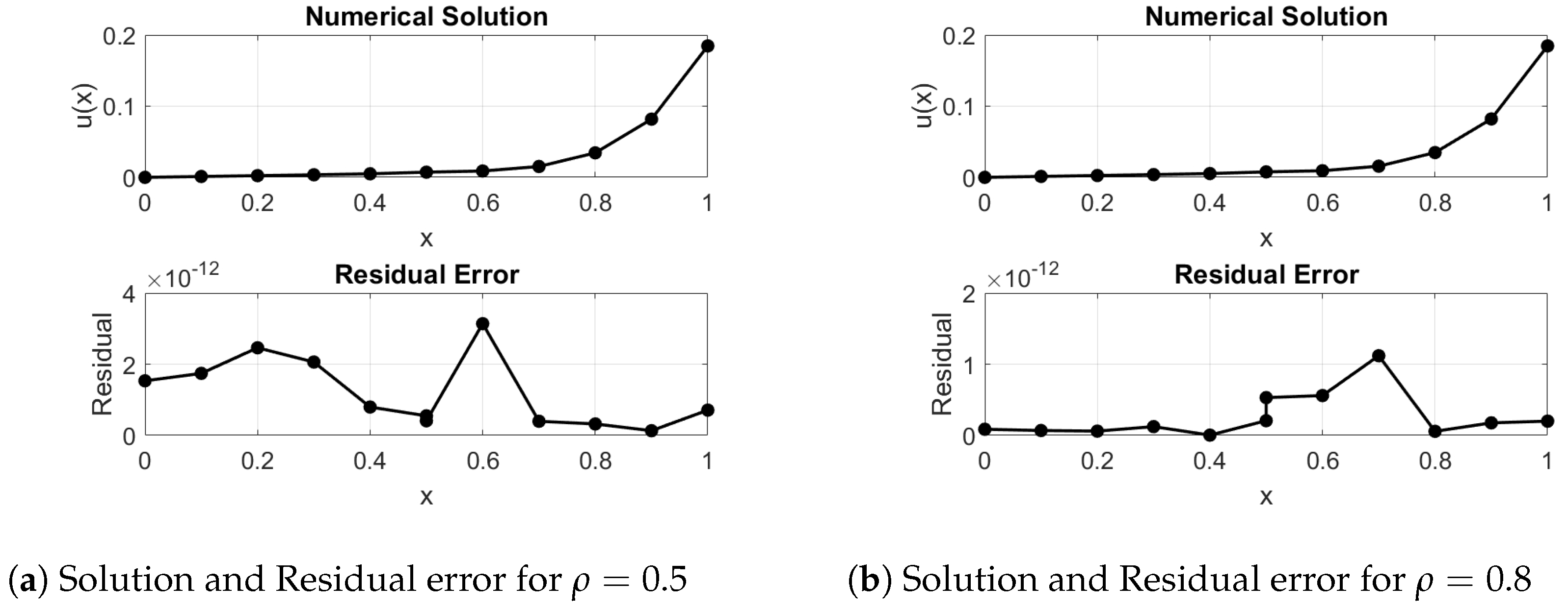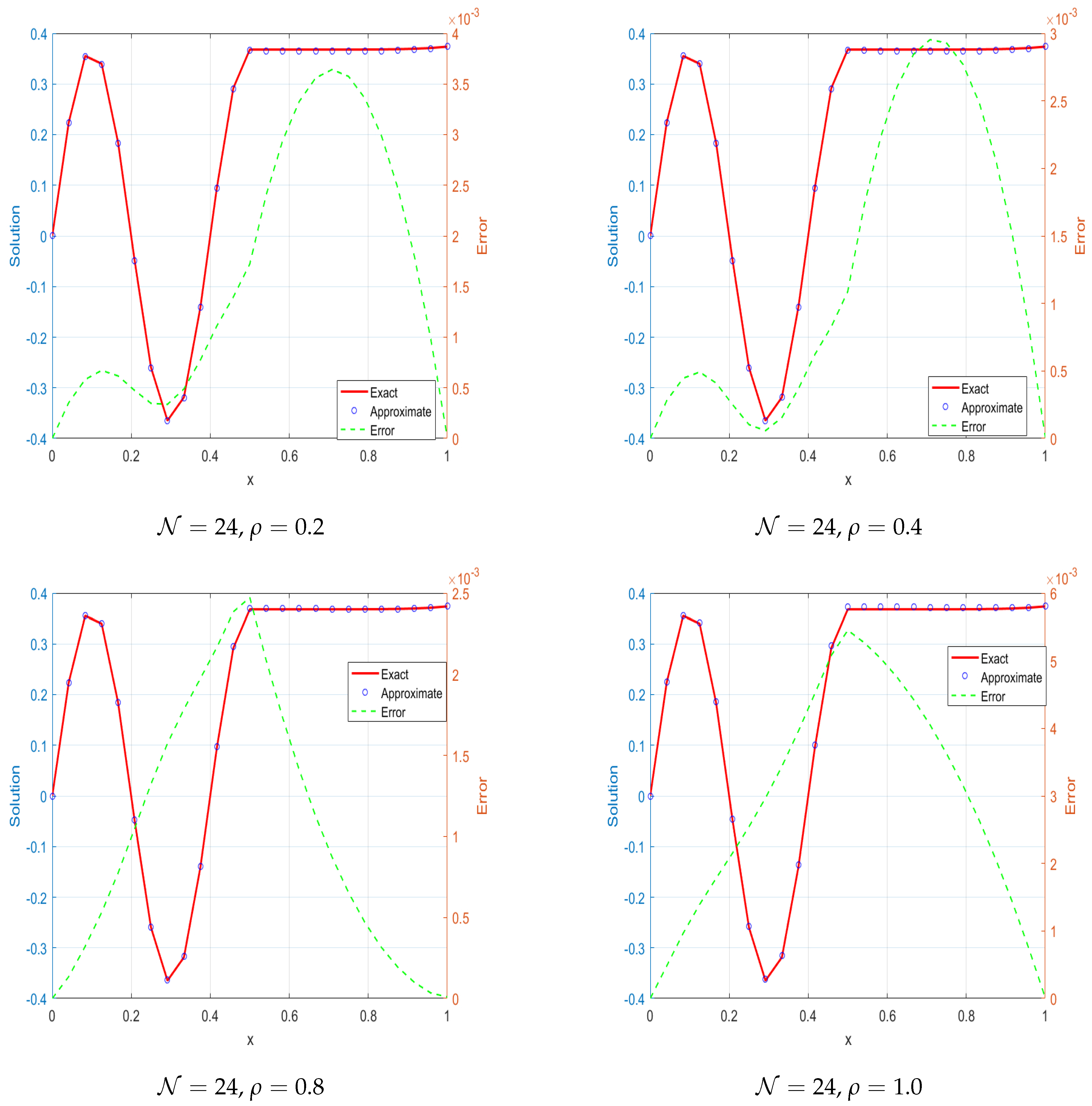 Example 4. As the fourth example, we present the 1D time-fractional interface Problem 1 with its initial and boundary conditions, for which no exact solution is available: We use the residual error to assess the effectiveness of the suggested MQ-RBF scheme because there is no exact solution for this problem. The residual errors for various values of ρ are reported in Table 4, demonstrating that the technique consistently produces modest residuals even for coarse discretizations. Plotting the numerical solution and associated residual error for and (see Figure 7) allows us to further evaluate the accuracy and validate the stability and dependability of the suggested method. Example 5. As the fifth example, nonlinear time-fractional interface Problem (1) is considered assuming and . Exact solutions and source functions are given byandwhere is the Mittag–Leffler function of two parameters defined asand To formulate the computational problem, the exact analytical solution is used to define the initial, boundary, and interface conditions. The MQ-RBF method is then applied to the nonlinear 1D time-fractional interface model, using both quasi-Newton linearization and a new splitting technique to address the nonlinear terms. Table 5 and Table 6 show that for various fractional orders ρ and discretization levels , the MAEs and RMSEs consistently decrease as increases, confirming the accuracy and convergence of the scheme. Although the method performs well for all values of ρ, smaller fractional orders yield slightly higher errors due to stronger memory effects. A comparison of the two linearization strategies indicates that the proposed splitting technique is more accurate and converges faster than the quasi-Newton method. This improvement results from its better handling of nonlinearities while maintaining numerical stability. A more direct comparison can be made by selecting the cases with the largest error reduction. At and , the innovative splitting technique yields an MAE of , which is approximately 38% lower than the MAE from the quasi-Newton method. Similarly, for and , the splitting method achieves an MAE of , showing an improvement of about 25% compared to the quasi-Newton MAE . We also computed the errors for different values of the parameter ω for the splitting method, and the results help in identifying the optimal choice of ω from Table 7. Figure 8 provides a two-dimensional error comparison of the methods, and additional figures (e.g., Figure 9) show the impact of varying for a fixed ρ. Example 6. As the sixth example, nonlinear time-fractional interface Problem (2) is considered assuming and . Exact solutions and source functions are given byandwhere is the Mittag–Leffler function of two parameters defined asand To accurately define the interface, boundary, and initial conditions for this nonlinear 1D time-fractional interface problem, the exact analytical solution is employed as a reference. The MQ-RBFs, enhanced by a novel splitting approach to efficiently manage the nonlinearity, is utilized to obtain the numerical solution. Computational experiments, detailed in