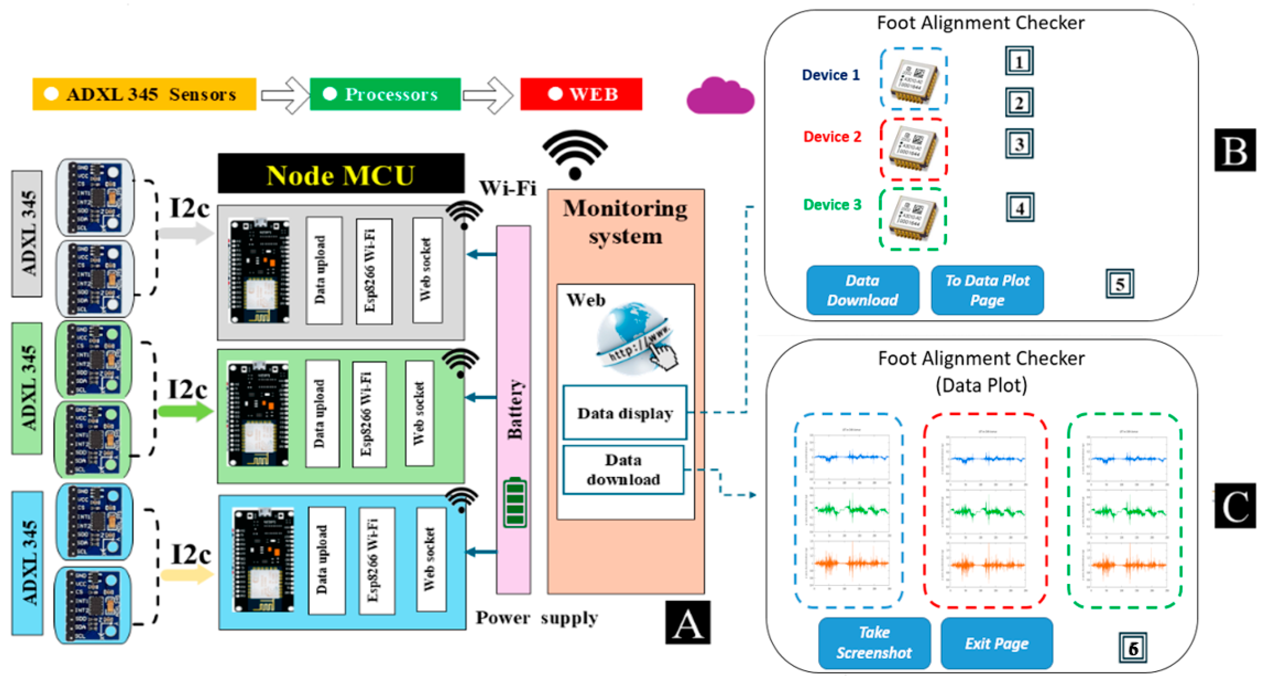 Figure 2. The design combines acceleration sensors and processor control boards to enable data acquisition on the hardware side. On the software side, the data is displayed on a custom webpage created using HTML, CSS, and JavaScript, allowing users to easily view and interpret the results [