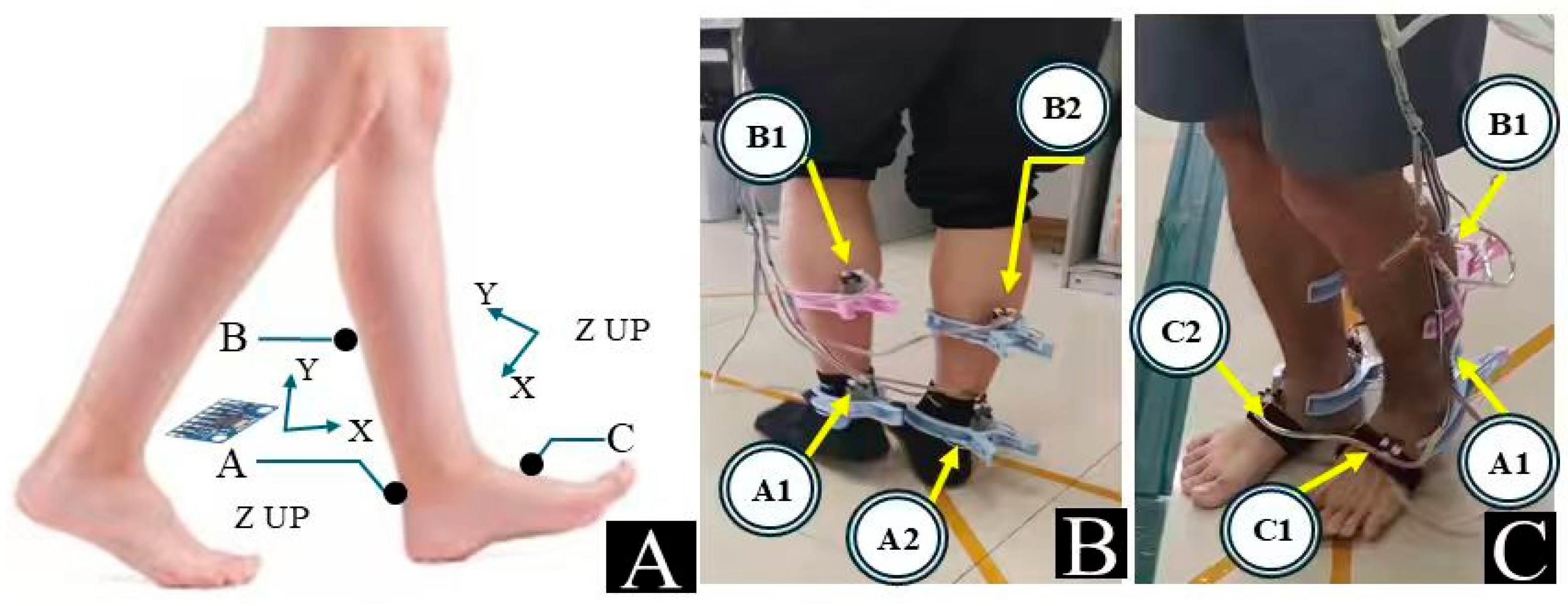 Figure 3 shown in, the setup results in a total of six sensors placed on both feet of the volunteer, with all sensors oriented such that their Z-axis faces upwards, aligning with the foot’s direction. As shown in