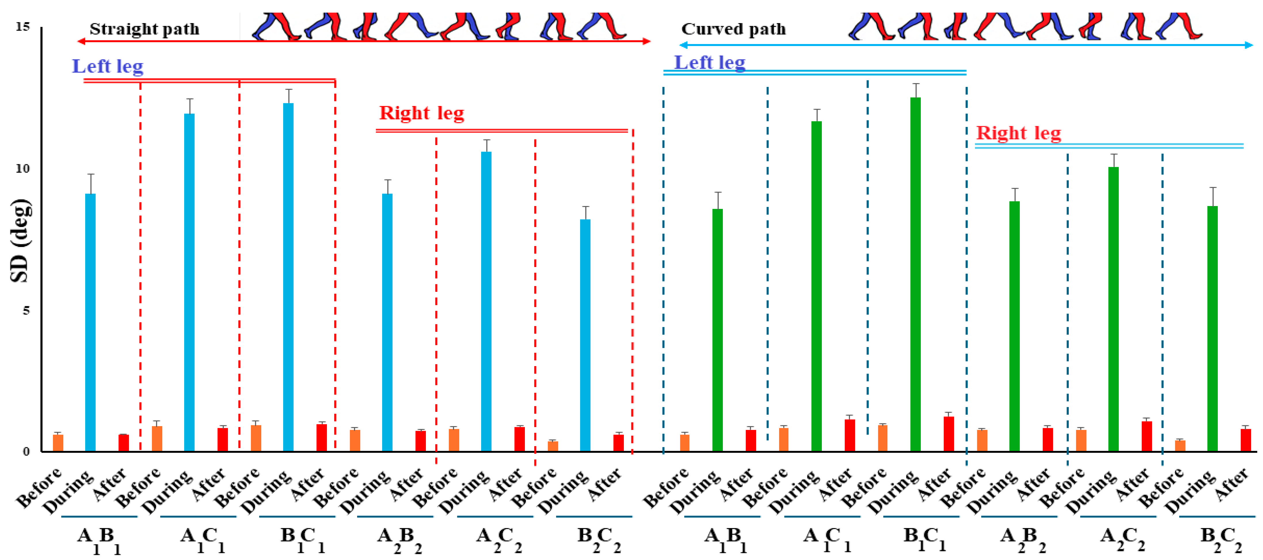 47]. Taller individuals generally exhibit smaller differences in angle variability. This is consistent with the idea that greater deviations in ankle alignment can cause significant deviations in the upper body, complicating the maintenance of center of pressure and balance. Moreover, the variability in the right foot was lower than the left foot, showing better control of the right foot [