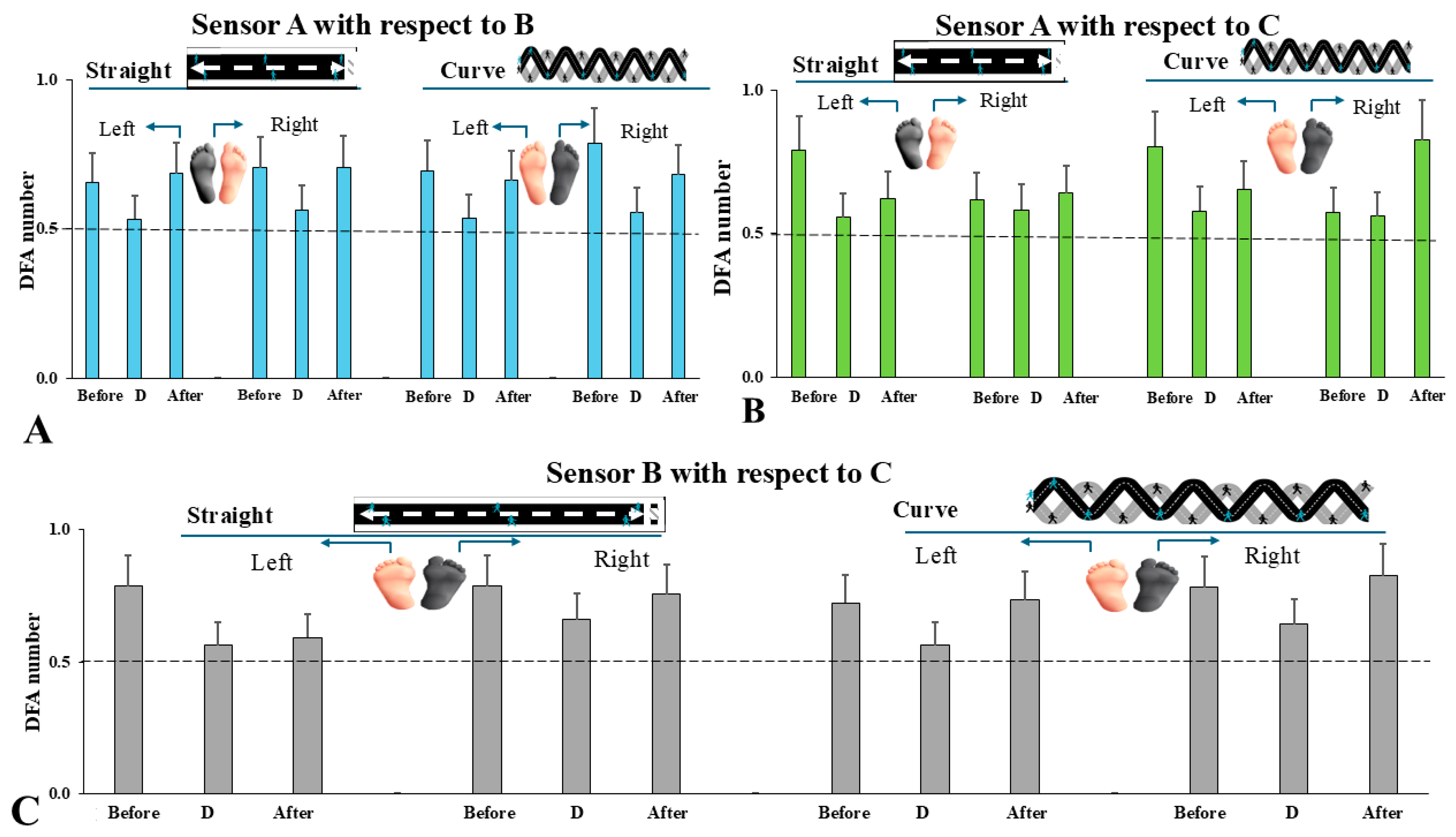 For Walking (Gait Variability): An α between 0.5 and 1 in walking data suggests a gait that is neither too rigid nor too random, with a balance that supports adaptability and stability. This is often seen as optimal for dynamic environments where quick, minor adjustments are needed to maintain a steady gait. This range indicates that the gait pattern has a stable structure with long-range positive correlations as we have in our results, meaning that past strides influence future strides, but not rigidly. This balance of variability suggests an adaptive gait, allowing adjustments for minor irregularities without over-correcting. Healthy young adults commonly show α values in this range, as it represents a flexible gait pattern with resilience to minor disturbances. Values closer to 1 may imply more consistent step patterns, while those closer to 0.5 reflect more variability but within a controlled range. In our results, the values for the left leg were closer to 0.5, while those for the right leg were higher, indicating more consistent control in the right leg. This can be attributed to the majority of right-footed participants in our experiment, which likely contributed to a more stable gait pattern on the dominant side.