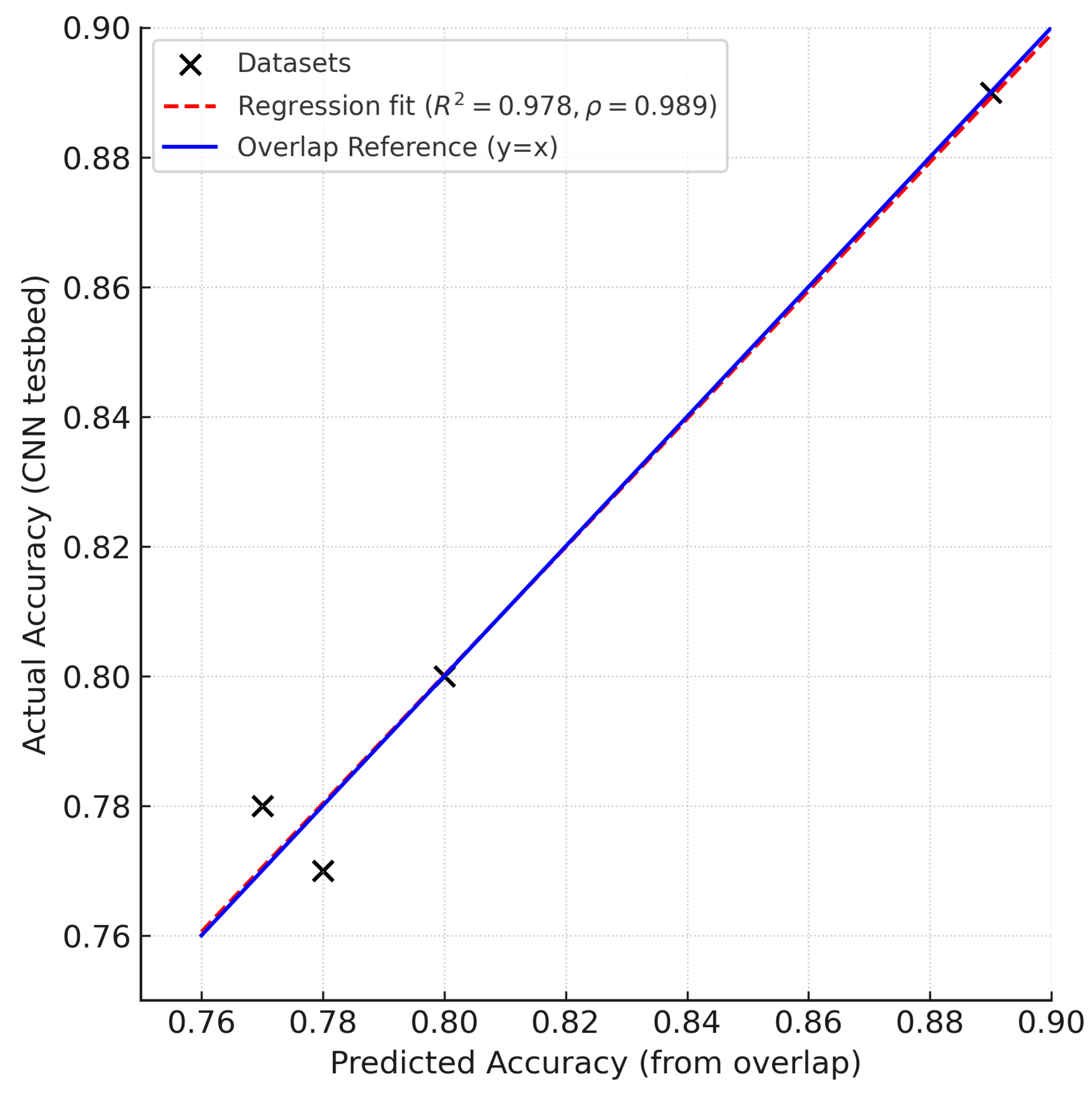 Second, the dataset similarity prediction algorithm achieved a strong correlation between predicted and observed performance on the synthetic testbed (, , ). The algorithm correctly estimated that Dataset 4, which shares the highest feature overlap with the testbed (87%), would yield the strongest performance (∼88.8%), whereas Datasets 1–3, with lower overlaps (65–75%), would perform similarly but worse. This result provides empirical support for the restricted-form CNN–Apriori equivalence proposed in this work, and suggests that feature overlap can serve as a meaningful proxy for expected model performance.