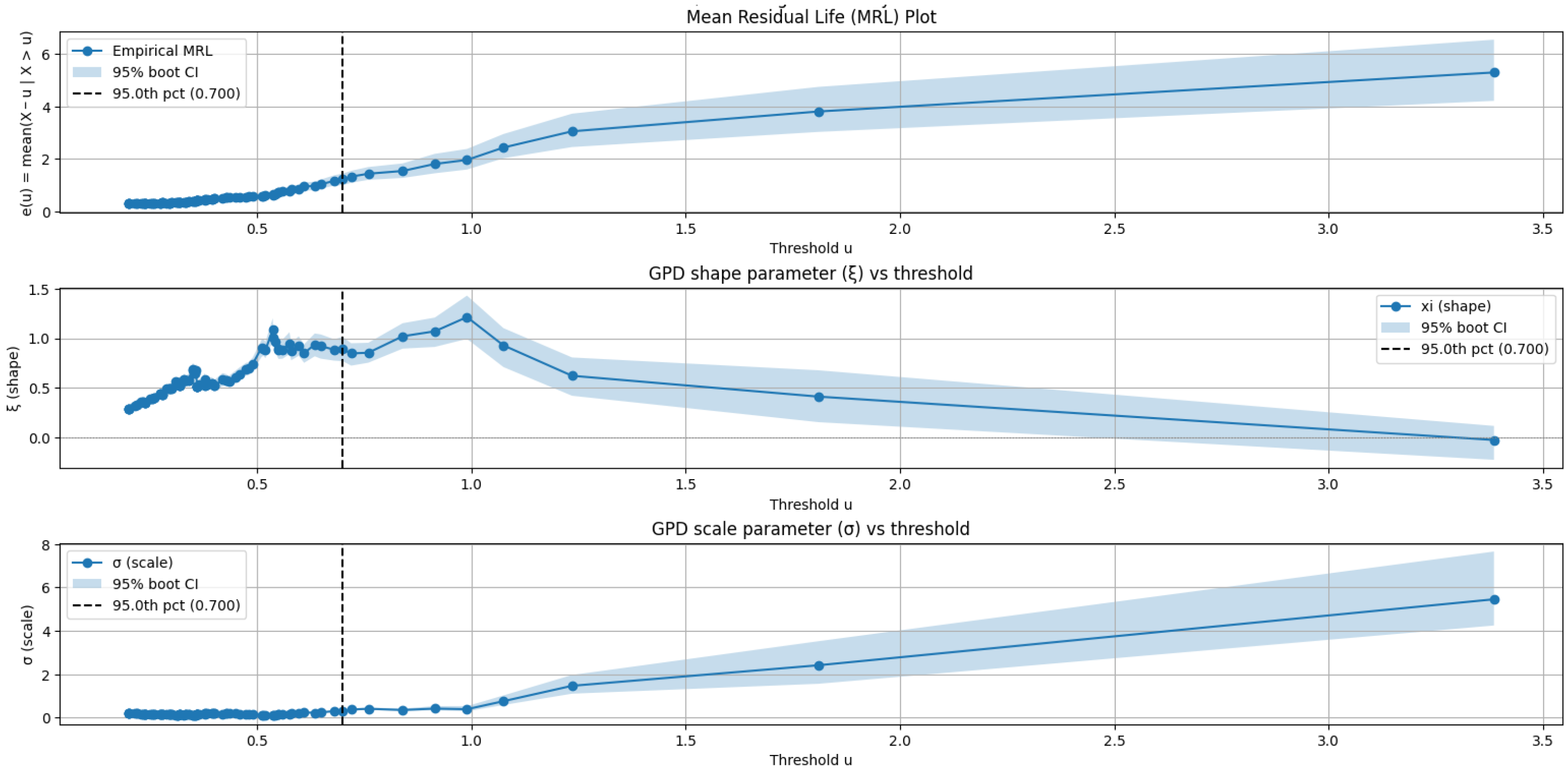 Figure 2. Mean Residual Life (MRL) plot and parameter stability plots for threshold selection. The MRL plot (top) illustrates the linearity region used to identify stable threshold candidates, while the shape (middle) and scale (bottom) parameter stability plots. The vertical dashed line marks the selected threshold value.