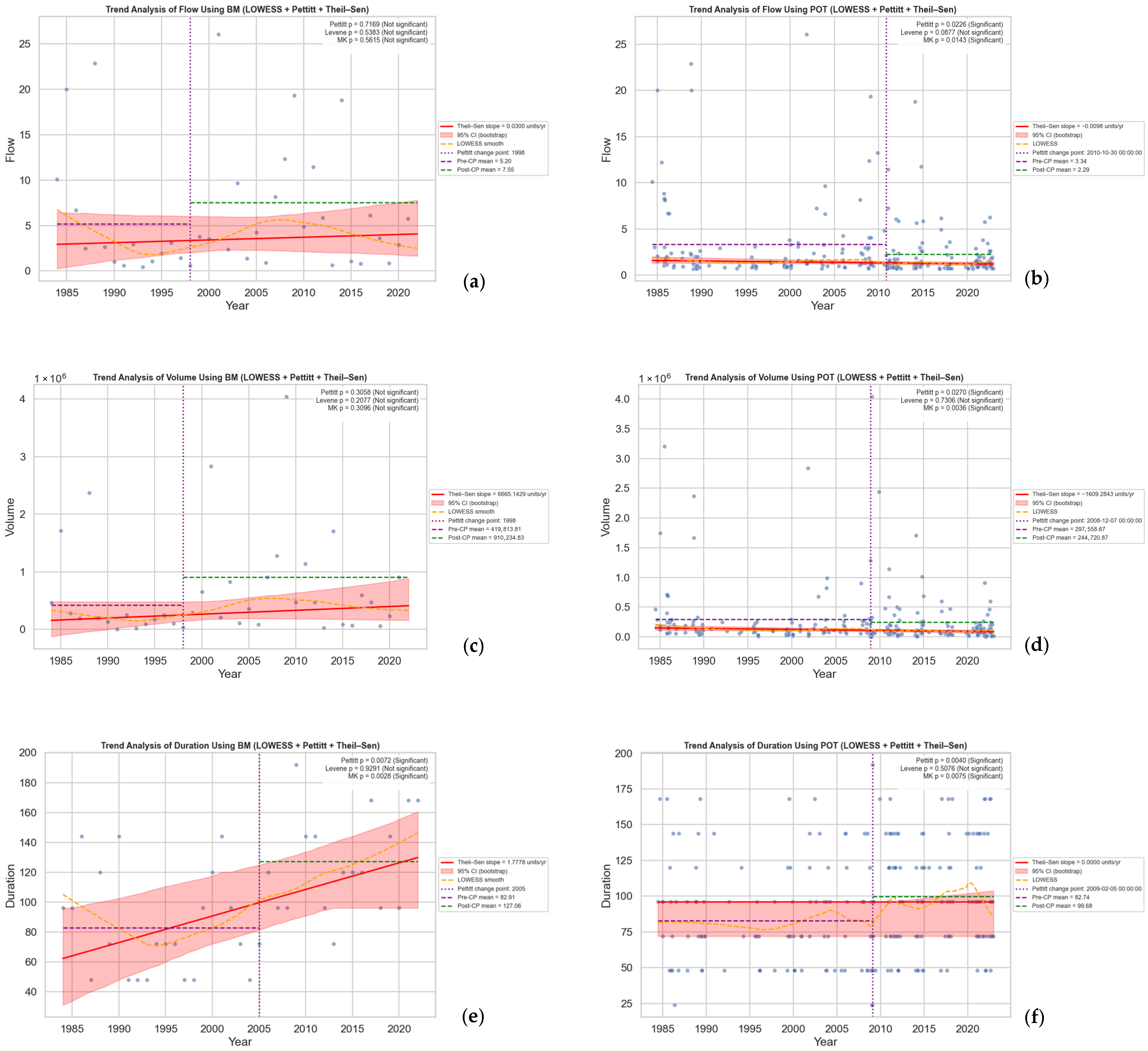 Figure 4. Trend analyses of peak flow, flood volume, and event duration derived using the Block Maxima (BM; left column) and Peak-Over-Threshold (POT; right column) extraction methods. Panels (a,b) present the temporal trends of peak flow, (c,d) show the trends of flood volume, and (e,f) depict the trends of flood duration. Each panel includes the Theil–Sen slope estimate (solid line), bootstrap 95% confidence intervals (shaded band), and Mann–Kendall test results indicating the presence or absence of significant monotonic trends over the study period.